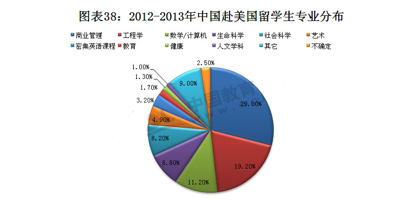 圖表39顯示的是2011-2012年英國(guó)國(guó)際留學(xué)生專業(yè)分布情況,其中商業(yè)管理、工程學(xué)、社會(huì)科學(xué)三大專業(yè)位列前三名,對(duì)于英國(guó)國(guó)際留學(xué)生來(lái)說(shuō),是最熱門(mén)的專業(yè)。其中,學(xué)習(xí)商業(yè)管理的學(xué)生占英國(guó)國(guó)際留學(xué)生總?cè)藬?shù)的29.99%,即約有三分之一留學(xué)生在英國(guó)學(xué)習(xí)商業(yè)管理;在英國(guó),這一比例仍然遠(yuǎn)超其它專業(yè);其次,是工程學(xué),其比例是英國(guó)國(guó)際留學(xué)生總?cè)藬?shù)的11.90%,約有五分之一的英國(guó)國(guó)際留學(xué)生以工程學(xué)為專業(yè);有8.91%的英國(guó)國(guó)際留學(xué)生學(xué)習(xí)社會(huì)科學(xué)專業(yè)。學(xué)習(xí)這三個(gè)專業(yè)的英國(guó)國(guó)際留學(xué)生比例約占其總?cè)藬?shù)的50%。