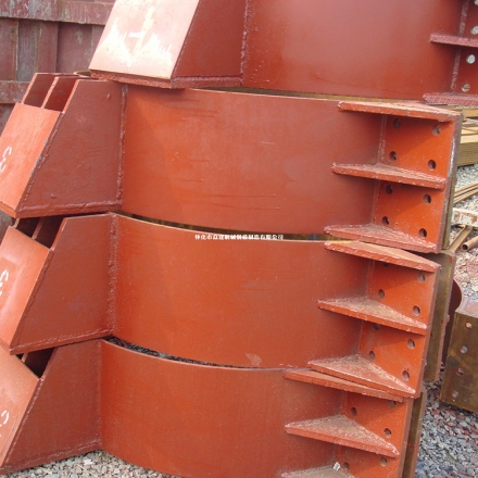箍裝置由箍板、翼板、拉結(jié)筋板、螺栓及內(nèi)襯墊構(gòu)成。抱箍有好多種,電纜抱箍,電線桿抱箍,拉線抱箍,吊線抱箍,不銹鋼抱箍都是比較常用的.一種嵌入式抱箍,它是由左、右兩半片抱箍對合后聯(lián)接而成,左、右兩半片抱箍均呈半圓環(huán)狀,半圓環(huán)兩端向外彎折,各形成一個安裝耳,其特征在于:所述的左半片抱箍一端的安裝耳上開有嵌槽,相應(yīng)的,與其相配合的右半片抱箍相應(yīng)端的安裝耳上設(shè)置有銷軸,右半片抱箍一端安裝耳上的銷軸嵌入左半片抱箍一端安裝耳上的嵌槽湖南鋼模板,湖南橋梁鋼模板,湖南掛籃